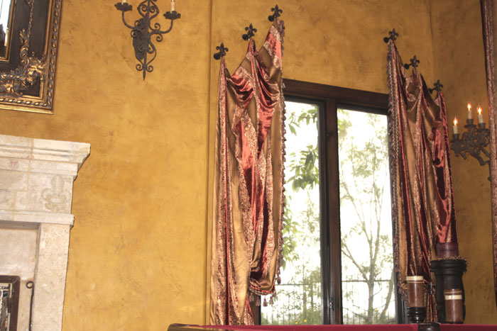 design of a Venetian plaster aged with wax and left matte. Adding sculpted
